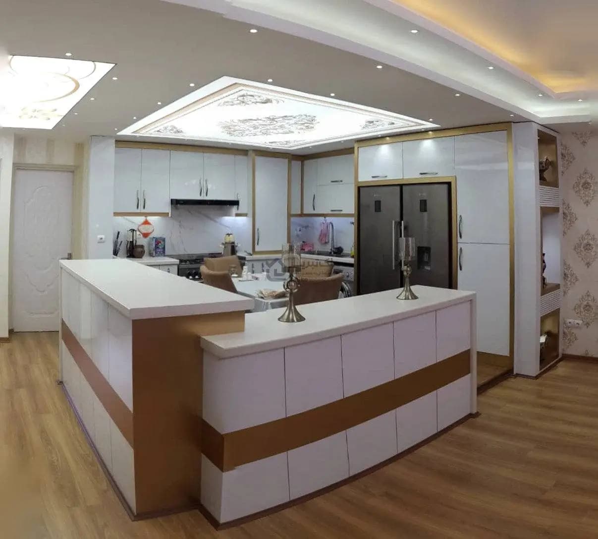 5. - آشپزخانه جادار با کابینتها از جنس هایگلاس - کف پارکت و سقف آسمان که به واحد روشنایی و جلوه خوبی می دهد
